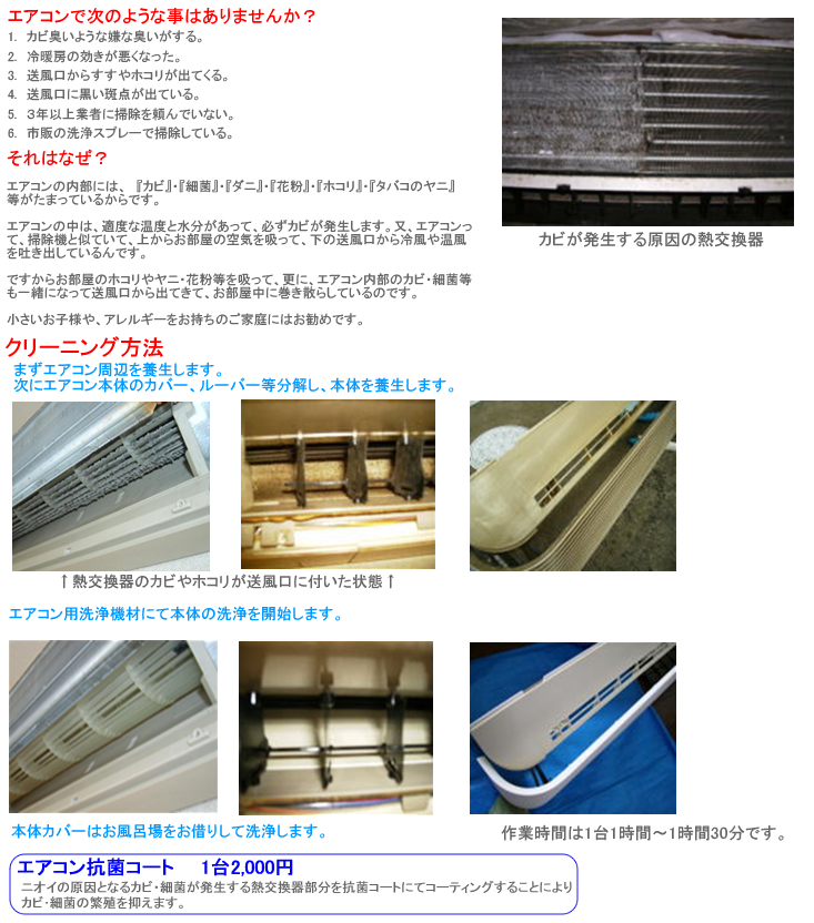 *○○○円〜は、汚れ具合等で追加料金が発生いたします。 目安として、3年以上エアコンをご使用ですと2000円プラスとなります。ご不明な場合は無料見積もりにお伺いします。